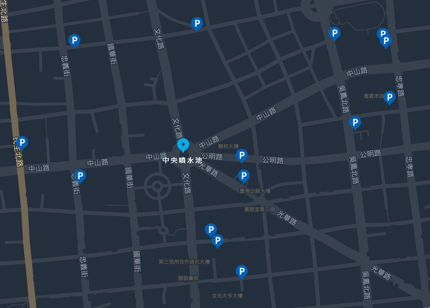 中央噴水池:嘉義市中山路中段的圓環嘉義人精神的地標~民國五十九年許世賢女士擔任市長時興建七彩的中央噴水池,池內噴泉蘊含十四種變化,約每十五分鐘一輪迴,水高可及二十公尺,尤其夜間噴水時,五彩繽紛變化多端,美不勝收。現今每逢選舉之前一日,各候選人帶著群眾在此地造勢較勁,成為中央噴水池的一大特色,同時也成為嘉義人精神的地標。