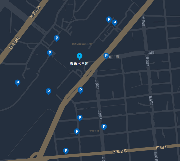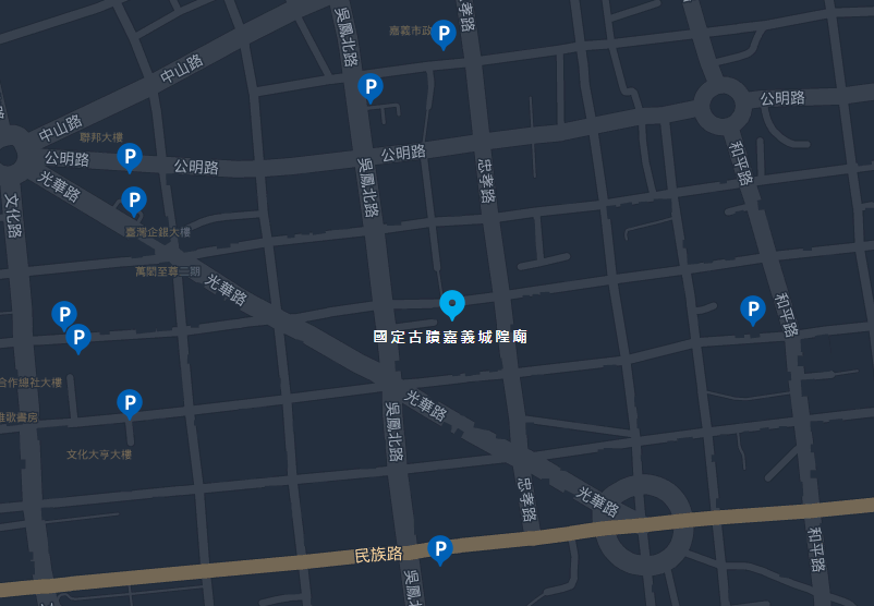 中央噴水池(中山路(大通,經中央噴水池)) → 國定古蹟嘉義城隍廟(公明路(醫生街)→東市場→東門圓環→南門圓環→城隍廟) → 嘉義火車站(光華街→中正路(二通)→嘉義火車站)