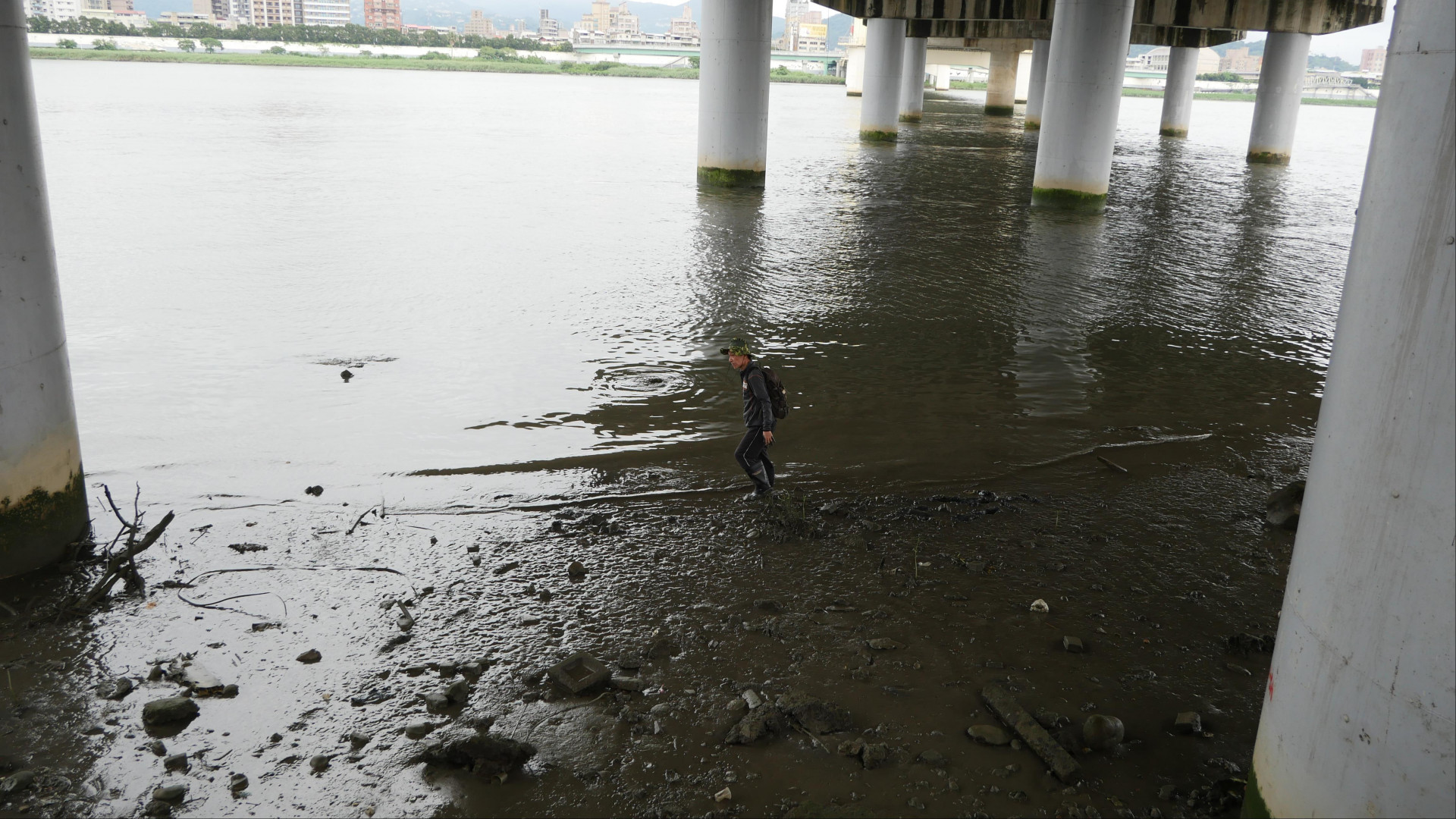 《走河》是一件行為藝術,藝術家在淡水出海口取一瓢水,再背著那桶水,經過淡水河、新店溪、景美溪、石碇溪,然後站在河裡將水桶的水倒在頭上,試圖藉由一瓢河水引領的旅行中,表達藝術家對水的禮讚,接受水的洗禮。