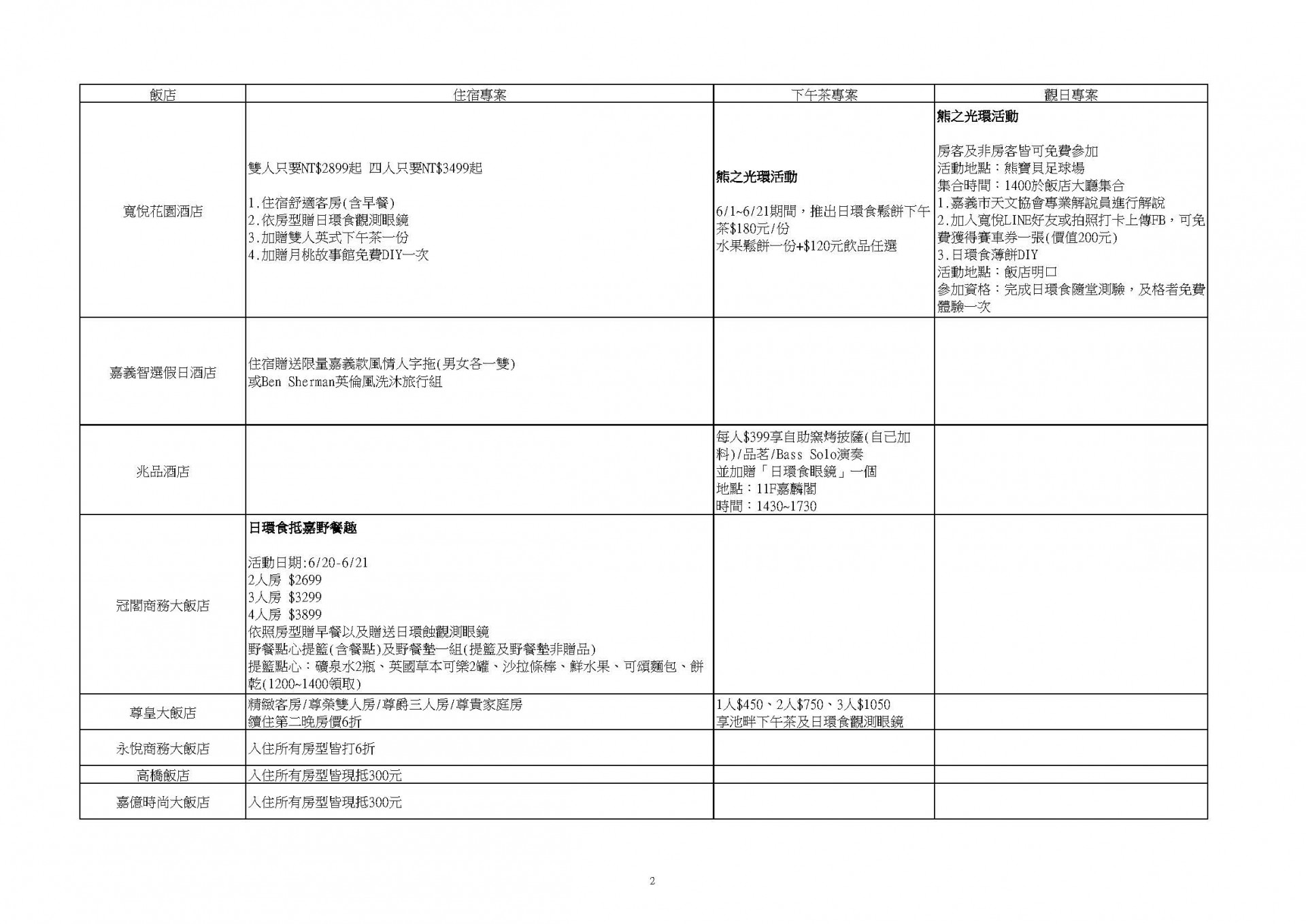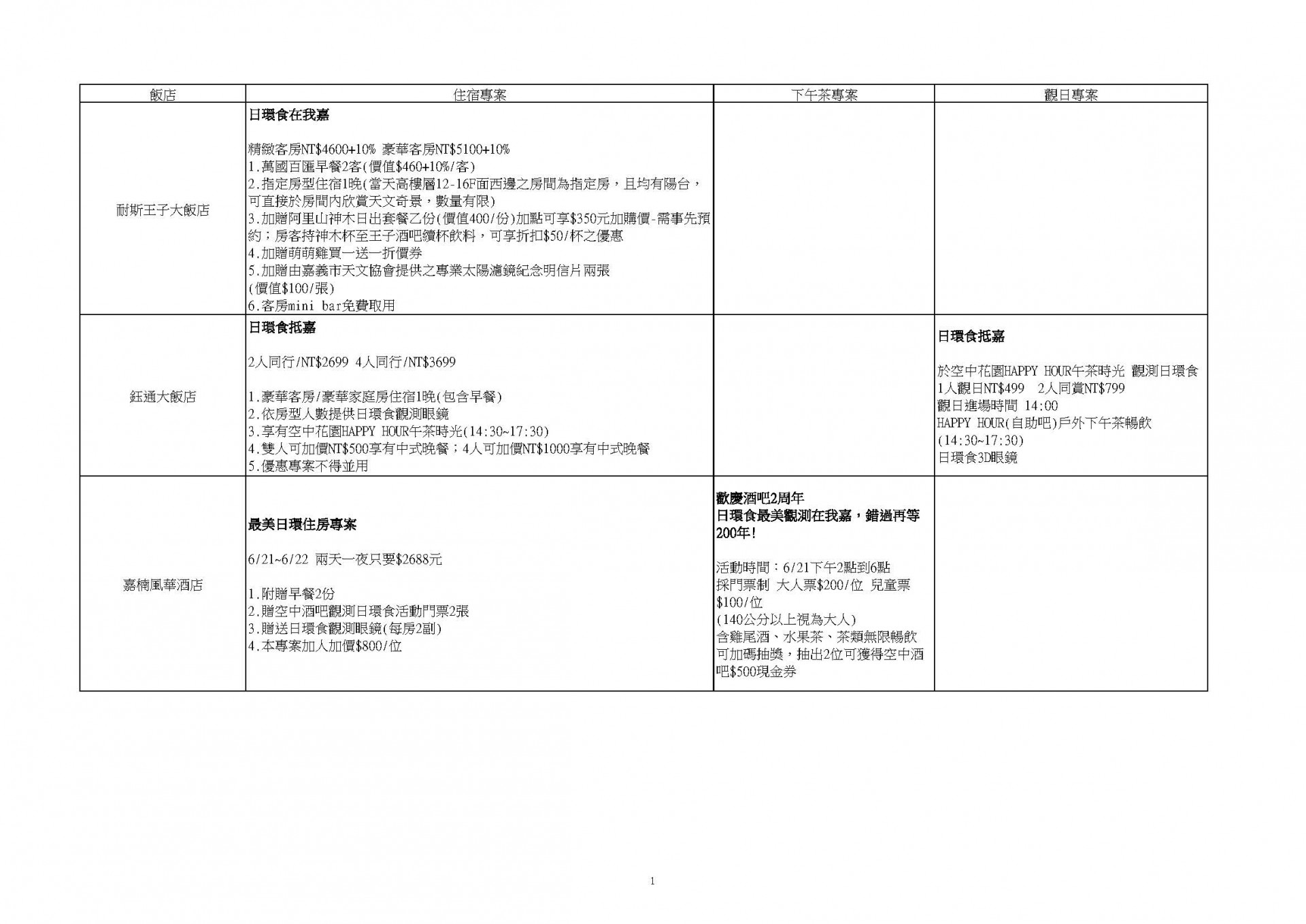 為迎接6月21日夏至日環食的天文奇景,嘉義市政府今(25)日於嘉楠風華酒店舉辦行銷記者會,旅館業者代表齊聚在酒店R樓空中花園,邀請民眾預先體驗觀看日環食的愜意,共有15家旅館業者推出住宿或餐飲優惠專案來共襄盛舉,例如:飯店高樓層(12-16F)、面西邊、附陽台的房型,可直接於房間內欣賞天文奇景;飯店頂樓的空中花園,觀賞日環食不用人擠人;另外還有業者加贈雙人英式下午茶,悠哉吃美食賞日環食;貼心附贈觀賞日環食的專業太陽濾鏡,讓各地天文愛好者歡喜來嘉觀賞日環食。
