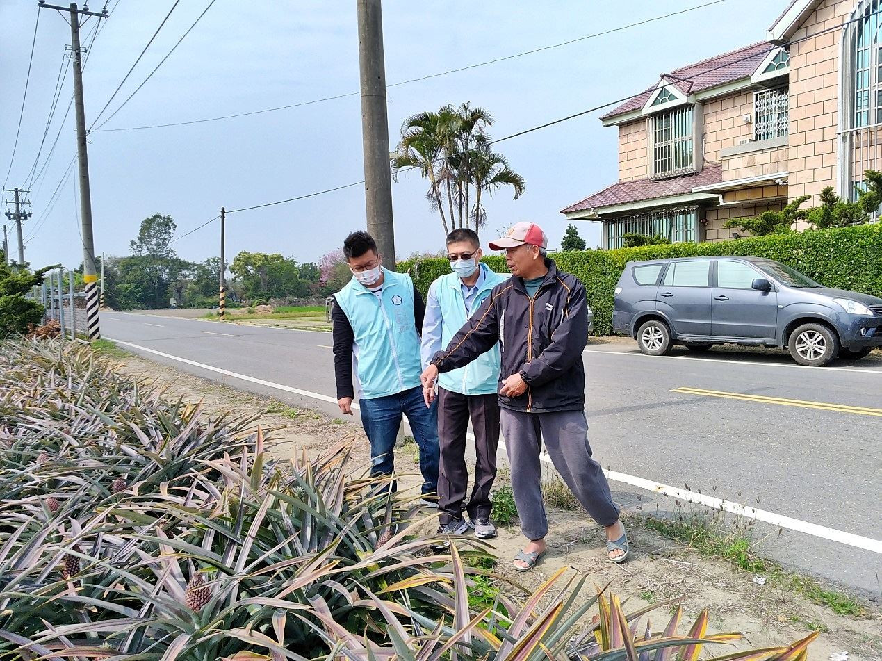 為了解鳳梨批發交易及農民生產之情形,今(3)日嘉義市政府建設處長田長沛至果菜市場與果菜市場股份有限公司謝宗桓總經理,了解目前鳳梨批發交易之情況;隨即又到本市鳳梨農田區,現地關懷農民、鳳梨農作生長及產期的關係,表達市府對鳳梨產銷及農民收益的重視。建設處表示,市府關心農民,果菜市場公司將積極協助農民在批發市場、網購平台銷售,讓產品賣得順暢、賣得好。