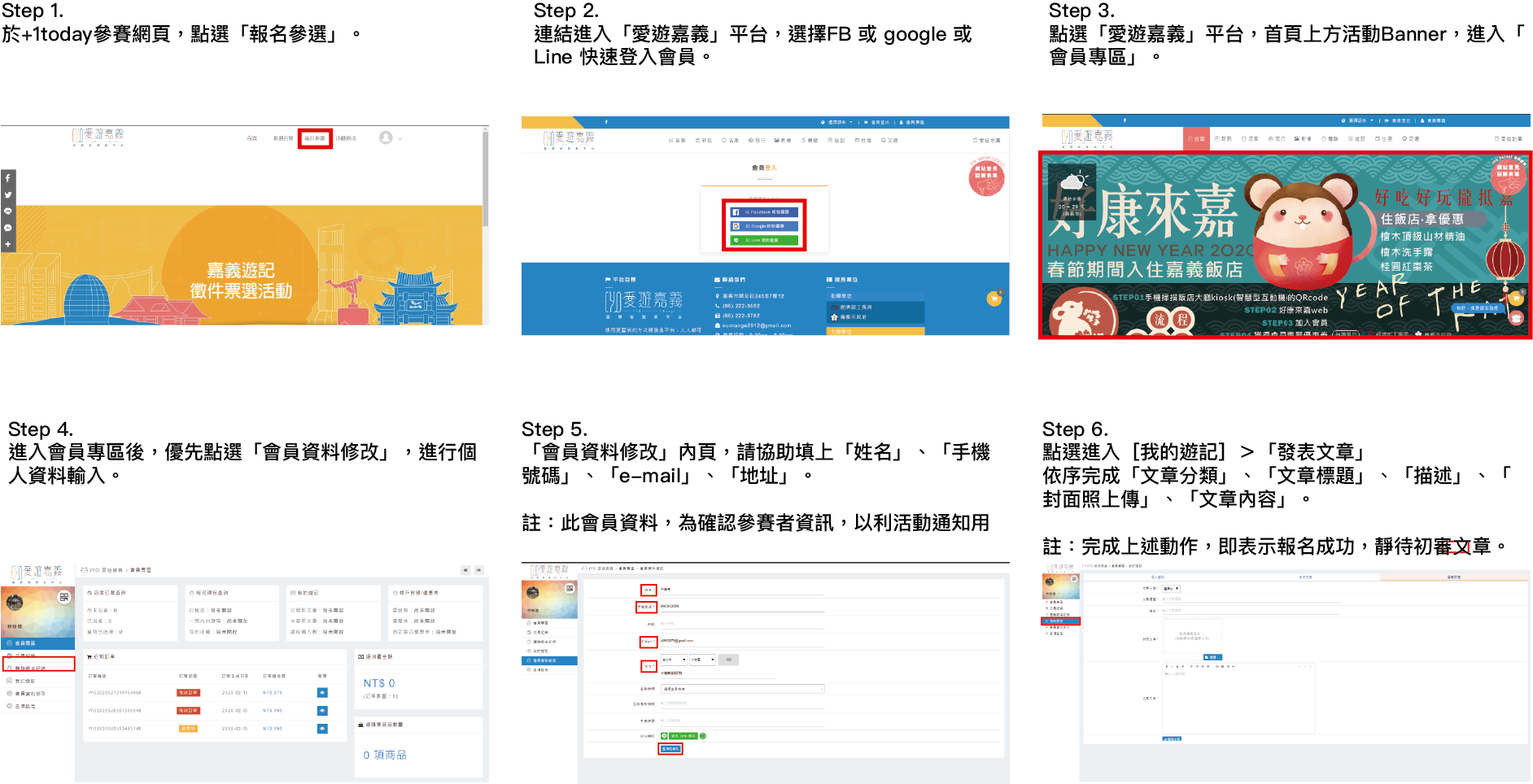 大家好,感謝熱烈參與本次活動的參賽者,由於自徵件日期2020/04/01至今(2020/04/29),參與人數未如預期,故本團隊將直接寄送一張住宿券給予2020/04/28 23:59 前,完成遊記投稿之參賽者。在這邊煩請各位參賽者協助於2020/05/13 18:00前,進入會員專區>會員資料修改,將姓名、手機號碼、e-mail及地址填妥,以便本團隊與您聯繫並將獎項寄出,如逾期未填寫資料內容,即表示參賽者放棄獎項領取權利!此外,本團隊依舊會將各位參賽者所投稿之文章分享於「愛遊嘉義」(本網站)的「遊記」頁籤中,讓各位參賽者的文章可以分享給更多民眾觀看,一起到嘉義吃喝玩樂,住飯店、享美食吧!