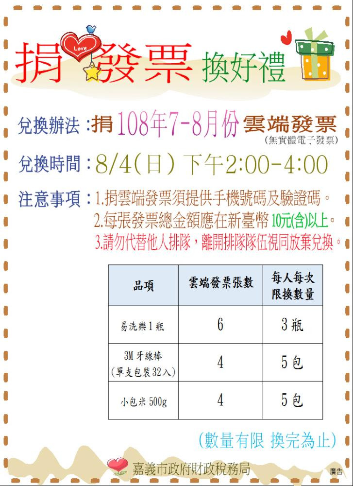 捐108年5-7月雲端發票 換好禮,宣導品數量有限,換完為止,歡迎民眾踴躍前往共襄盛舉。