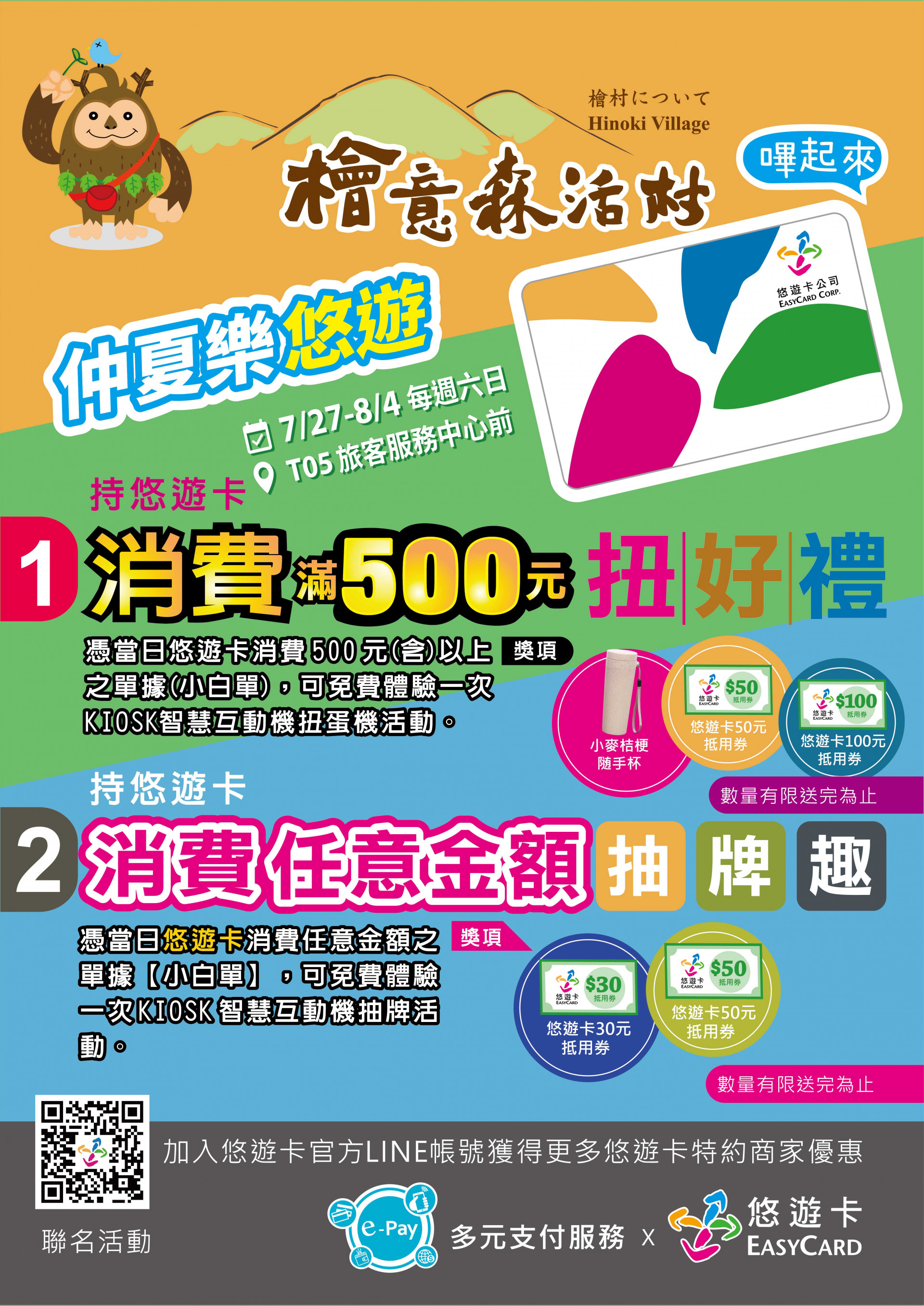 「來嘉一夏」暑期好康特惠來了~😍「檜意森活村」、「嘉樂福夜市」推出多元支付優惠活動😍✹7/27~8/31使用多元支付消費進入「九宮格連線抽大獎」遊戲,連線成功就有機會兌換清涼造型冰棒、精美鑰匙圈或現金抵用券。✹同時在9/5有機會抽中嘉義市各大精品旅館的住宿券及支付業者加碼等多項好禮。
