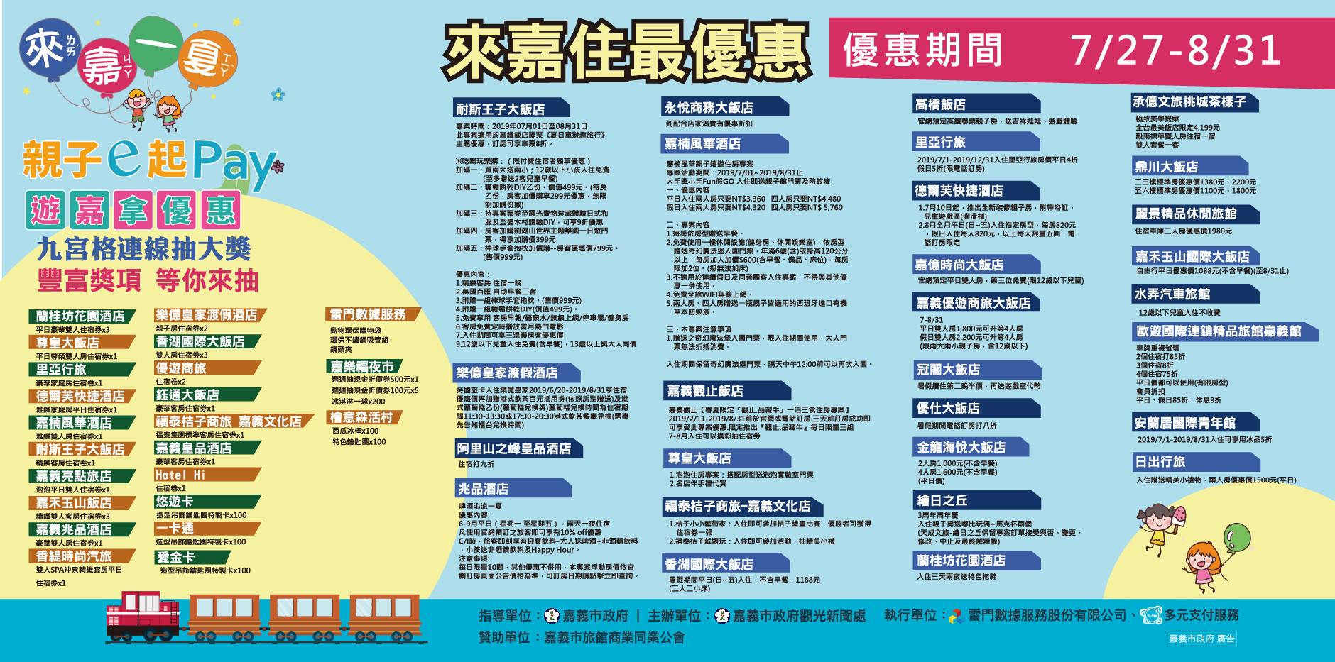 耐斯王子大飯店 地址 :嘉義市忠孝路600號 電話 : 05-2771999 專案時間 : 2019年07月01日至08月31日 優惠內容 : 此專案適用於高鐵飯店聯票《夏日童遊趣旅行》主題優惠,訂房可享車票8折。※吃喝玩樂購:(