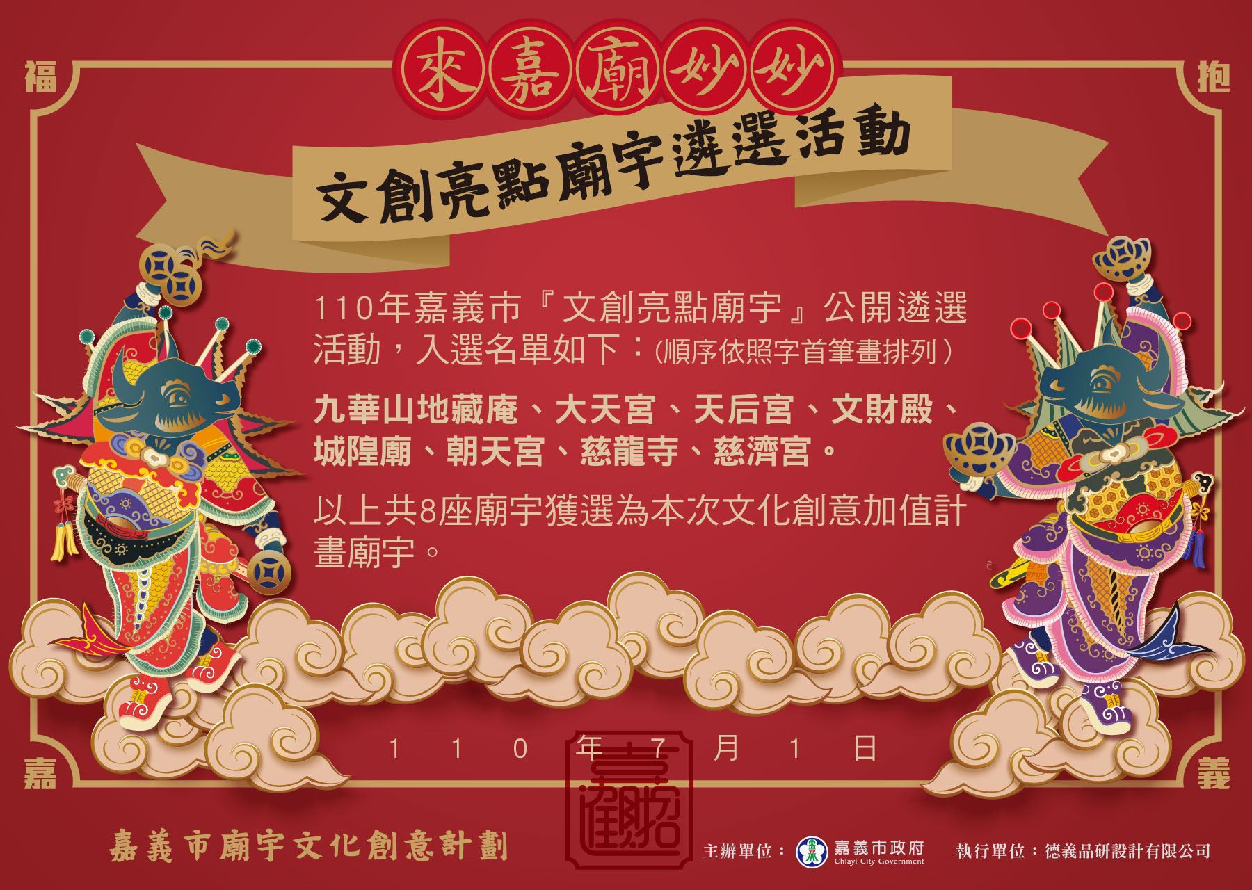 2021年嘉義市廟宇文化創意計畫,將盤點匯聚嘉義市各廟宇的能量,透過文創的加值,創造屬於嘉義市共同的信仰新風潮!首發的文創亮點廟宇遴選活動,以「福抱嘉義,來嘉廟妙妙」為主題正式起跑,文創亮點廟宇遴選活動報名收件於6月4日截止,共有18家嘉義市廟宇共襄盛舉!