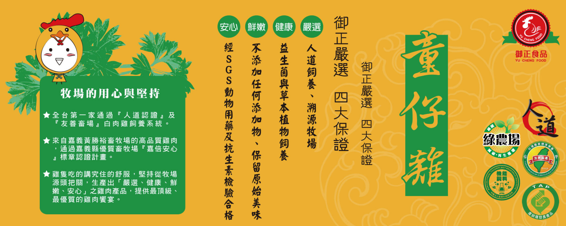 御正食品有自己的牧場,並以此取得多項認驗證,雞隻吃的講究住的舒服,堅持從牧場源頭把關、生產出「嚴選、健康、鮮嫩、安心」之雞肉產品,提供最頂級、最優質的雞肉饗宴