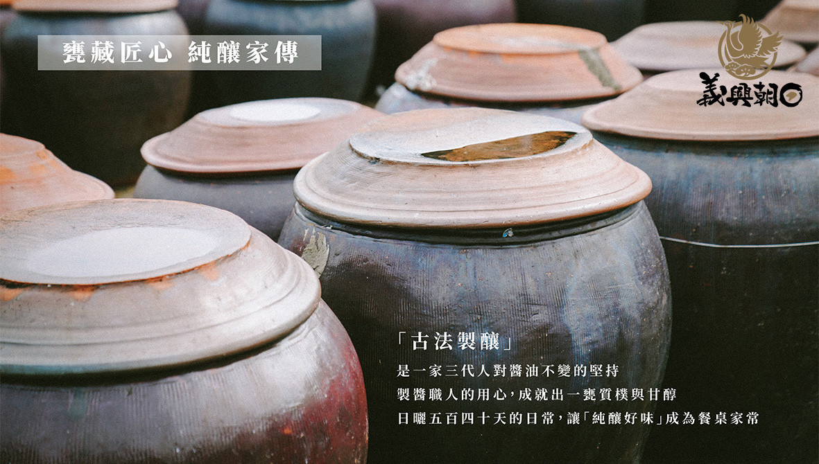 義興醬園成立於1949年,傳承三代的「義興醬園」每一代的傳承如同台灣時代轉變,民國38年第一代鄭崑山先生創辦,為了生計,挑著扁擔以徒步行走的方式,沿街叫賣販售手工醬油,足跡遍及嘉義縣市。民國52年創立商號,隨著台灣經濟成長,第二代接手後,研發新產品醬菜並搬遷廠房,將家庭醬油間轉為工廠化經營。104年交棒第三代,傳承至今,因應新市場需求及對食品安全的重視,將廠房環境的精進視為必要,對製醬工廠進行全面的環境及設備更新,將古法製程融合現代設備持續釀造出一瓶瓶甘醇醬油。義興醬園除了注重品質與研發,也致力醬油文化及食品安全的推廣, 104年研發出無添加黑豆蔭油系列產品、105年開放參觀釀造廠、106年加入全國純釀造公會、107年在東石漁人碼頭設立第一家門市,門市結合DIY體驗,讓家長、小朋友了解傳統黑豆醬油的作法,同年更獲選經濟部在地特色老店獎,108年獲嘉義市嘉市好店伴手禮獎。